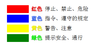 •  安全色是表達安全(quán)信息(xī)含義的顏色,表示禁止、警告、指令、提示等,規定為紅、藍、黃、綠四色。