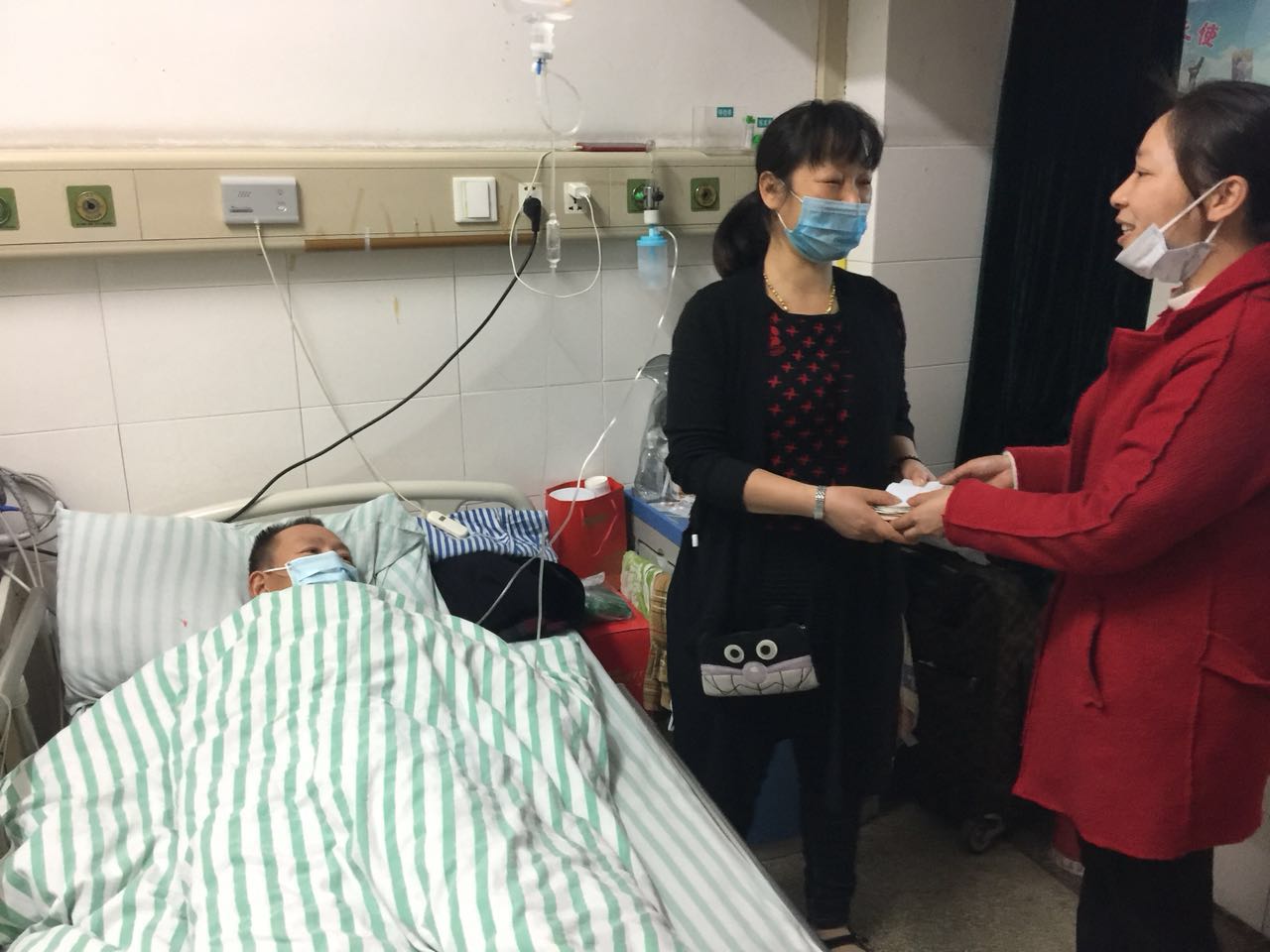 3月26日,丝瓜在线视频工會主席蔣俊、行政(zhèng)部(bù)林梅、員工汪明富帶著丝瓜在线视频所(suǒ)有員工的愛心(xīn)來到醫院看望。薑(jiāng)偉文正在照料病床上的愛(ài)人,並發症引起口角潰瘍無法進食(shí),每(měi)天24小時隻能靠鹽水維持,身形(xíng)消瘦,身體虛弱,昔日150斤的錚錚硬漢(hàn),如今隻有110斤(jīn)了,讓人無不動容。